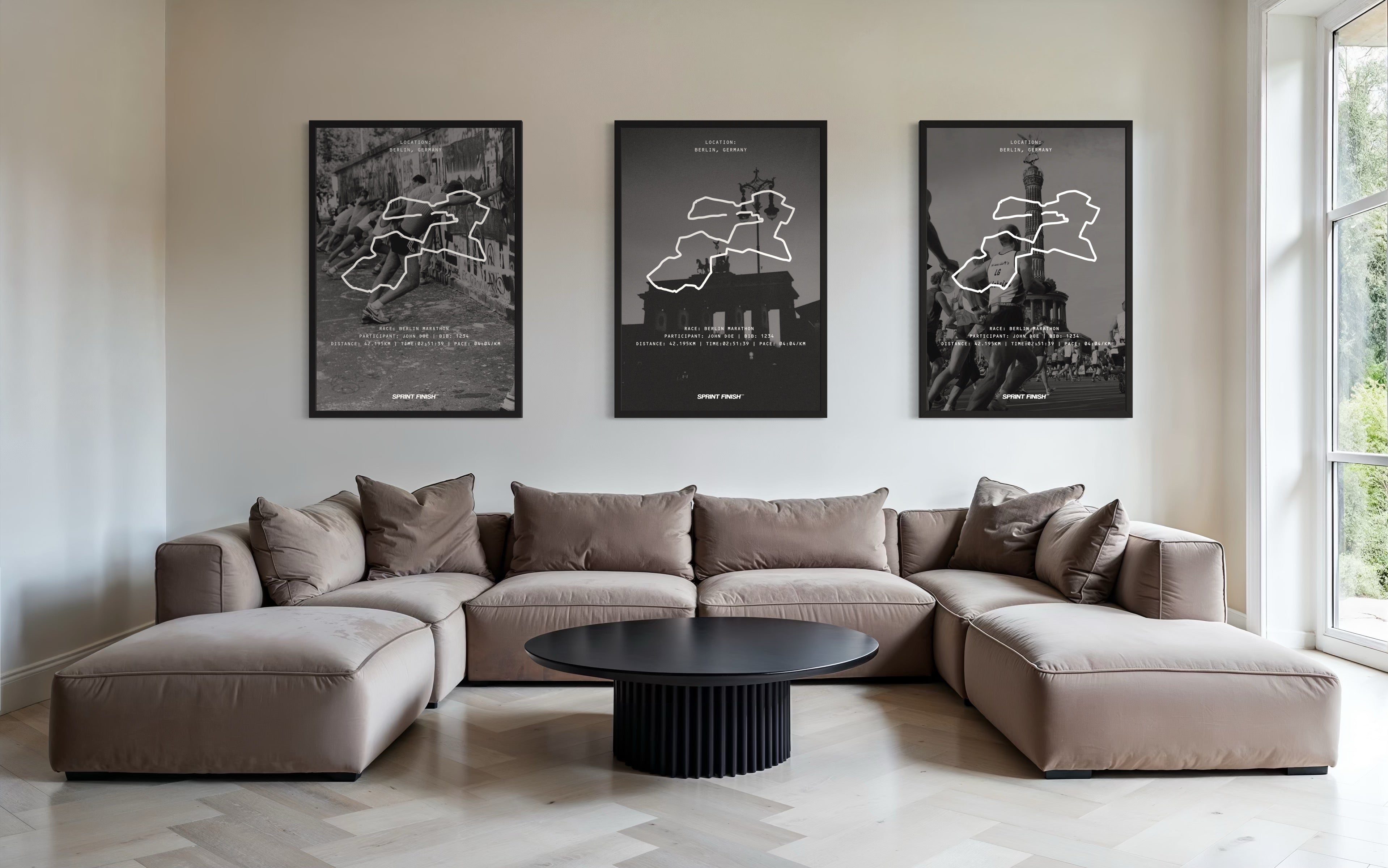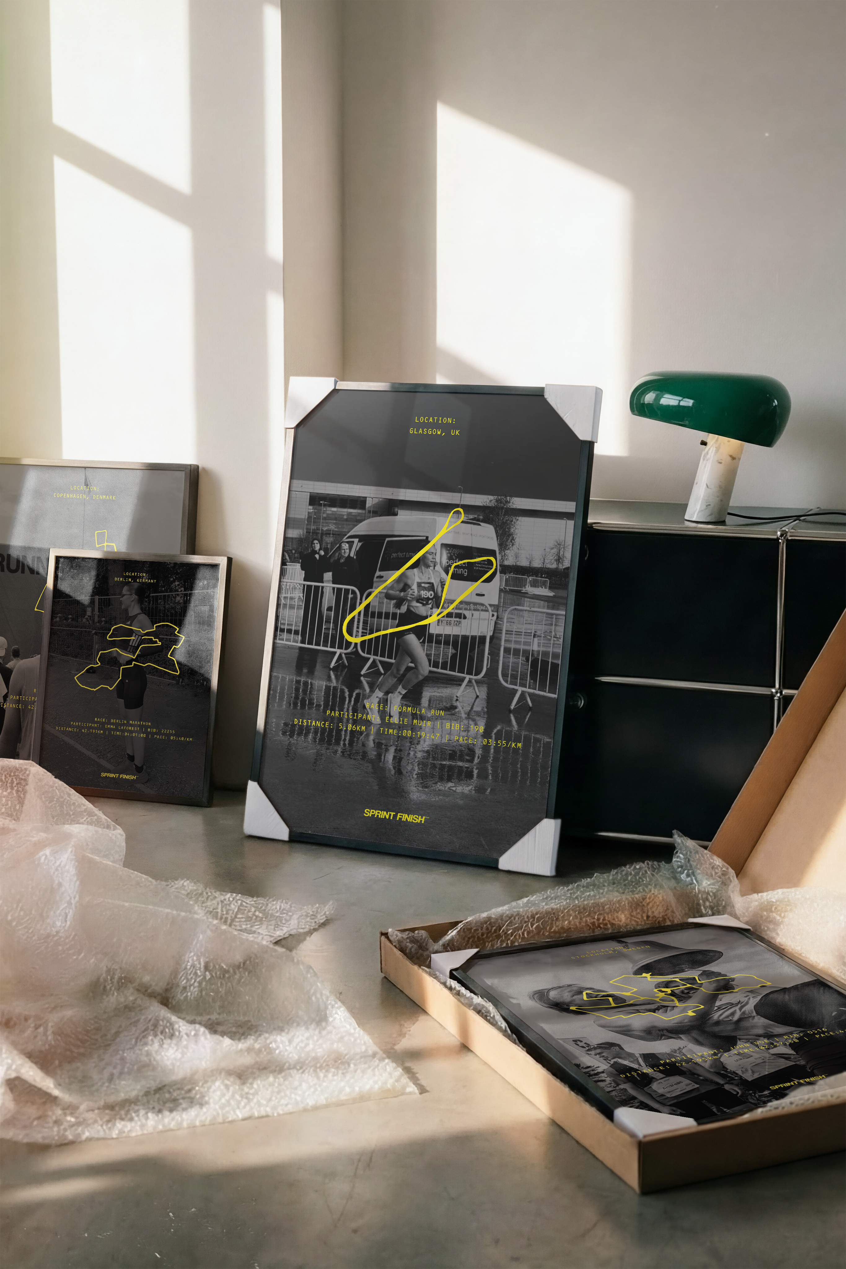 We’re proudly based in the UK and ship our custom race prints to runners all over the world. Everything we create is designed with intention — to help runners like you celebrate your success with wall art that feels as good as the finish line and matches your interior style.