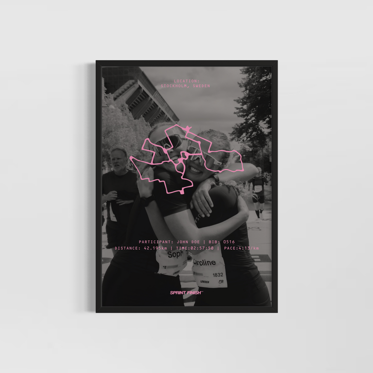 Custom route prints designed from your Strava data, finish times and a photo of you from race day - stylish wall art that tells your story.